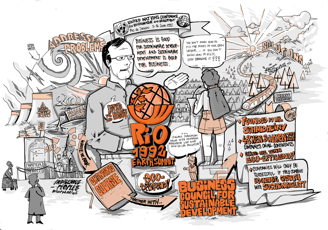 Stephan Schmidheiny wirkte in der Vorbereitung des Earth Summit massgeblich mit. 1990 lernte er am Rande einer Konferenz in Norwegen den Generalsekretär der UNCED, Maurice Strong, kennen. Auf Grund seiner Erfahrungen als Unternehmer und namentlich dank seines Rufs als Pionier beim Ausstieg aus der Asbest-Verarbeitung ernannte Maurice Strong Stephan Schmidheiny zu seinem Chefberater für Unternehmen und Industrie (Chief Advisor for Business and Industry). Stephan Schmidheiny entschied sich, für die Arbeiten einen Unternehmerrat für nachhaltige Entwicklung (Business Council for Sustainable Development BCSD) ins Leben zu rufen. Es gelang ihm innerhalb von knapp einem Jahr, rund 50 oberste Führungspersönlichkeiten aus verschiedenen Industrien und Regionen zu gewinnen. Ergebnis der Arbeiten des BCSD war der Bestseller «Kurswechsel. Globale unternehmerische Perspektiven für Entwicklung und Umwelt», der 1992 erschien und in 15 Sprachen übersetzt wurde. Darin begründete Stephan Schmidheiny das unternehmerische Konzept der Öko-Effizienz. Das Buch zeigt auf, wie die Unternehmen Umweltschutz mit ökonomischem Wachstum vereinen können. Das Präfix «Öko-» verweist dabei sowohl auf Ökonomie als auch auf Ökologie. Am 5. Juni 1992 stellte Stephan Schmidheiny die Ergebnisse der Arbeiten am Earth Summit vor.
